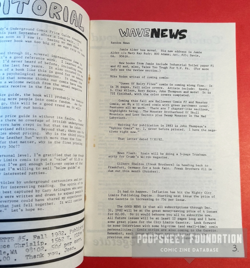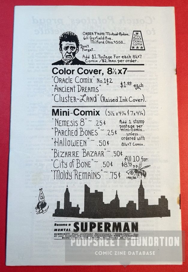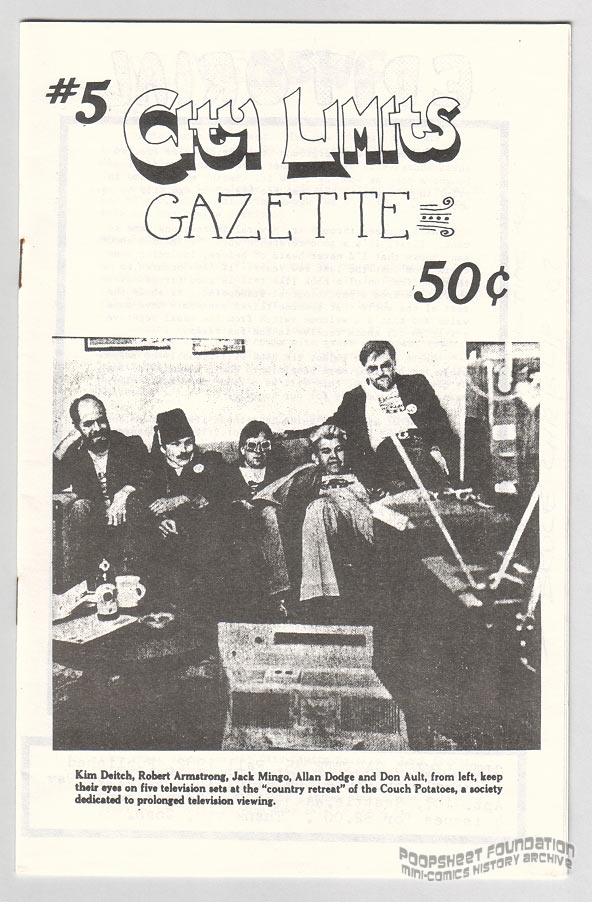 Bruce Chrislip's zine about the newave / underground comix scene. This issue's got: an UG column by Bruce Sweeney; news clippings about Robert Armstrong's Couch Potatoes; Michael Roden back cover ad; letters from Jay Kennedy and Joe Zabel; and the cover photo features Kim Deitch, Robert Armstrong, Jack Mingo, Allan Dodge and Don Ault.